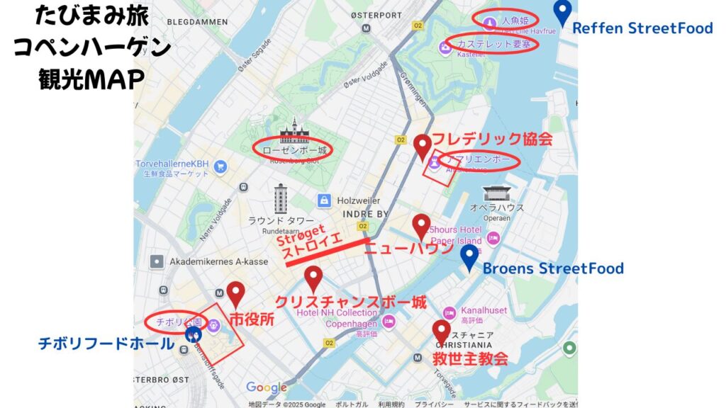 ちなみにですが、私はいつも観光地と空港からのアクセスを考えてホテルを選んでいます。コペンハーゲンではコンゲンスニュートー広場近くのホテルにしましたが、アクセスも良くとても便利でした。上の地図で言うと、コンゲンスニュートー広場はストロイエ通りの東端。ニューハウンまでも徒歩で気軽に行ける距離です。