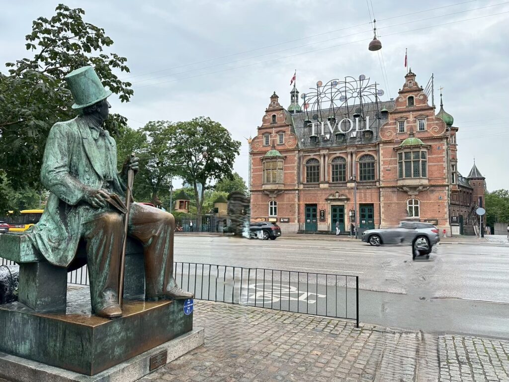 下の写真はチボリ公園を見るアンデルセン像。デンマーク出身の童話作家のアンデルセンは、チボリ公園に訪れて童話の参考にしたという話もあるようです。この像は市庁舎の前にあります。