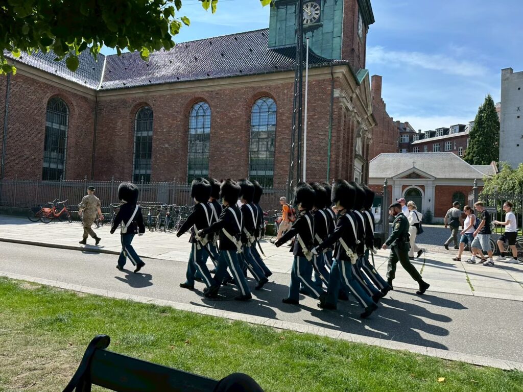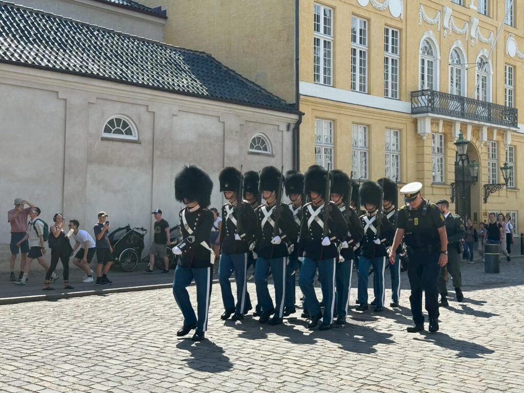 12時の衛兵交代のためにホテルから歩いてアマリエンボーに向かっていると・後ろから早歩きの衛兵たちに抜かされていきました!