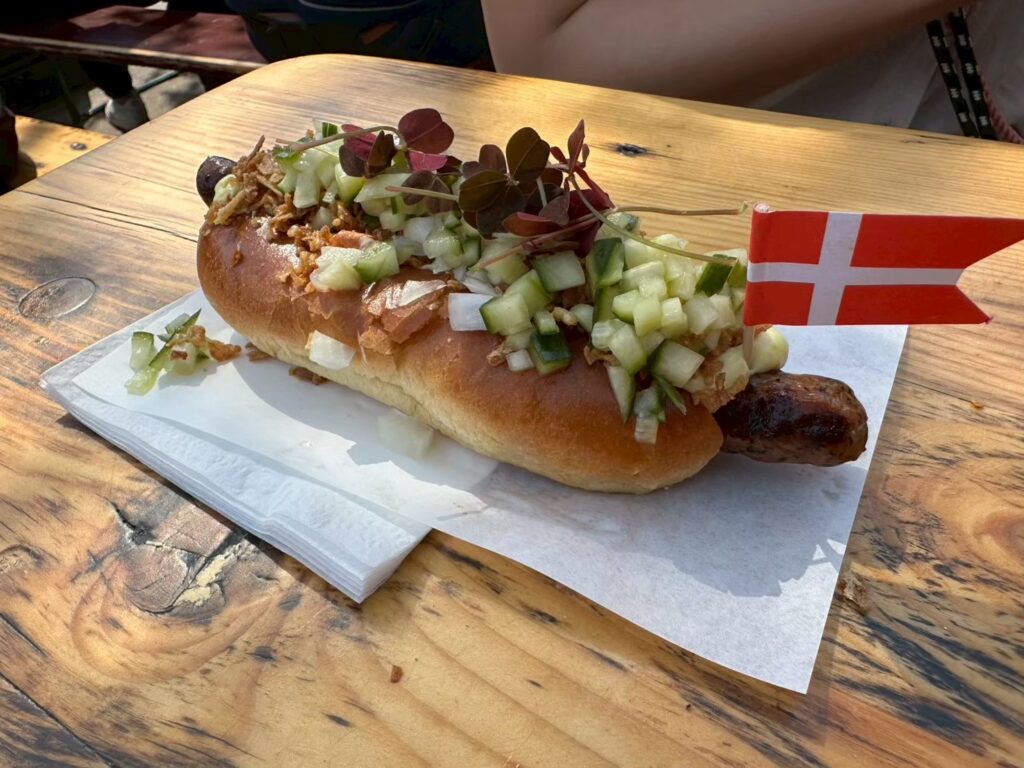デンマークではホットドッグが軽食として人気。コペンハーゲン風のホットドッグは刻んだきゅうりと揚げた玉ねぎが乗っているのが特徴みたい。他のお店もきゅうりと揚げた玉ねぎは乗っていたので定番のようです。おいしいですよ。